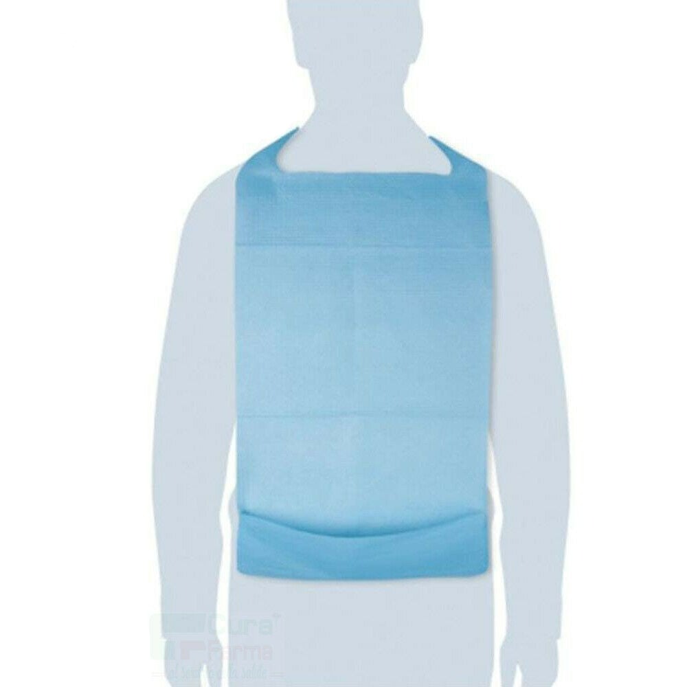 Bavagli monouso in TNT con tasca raccogli-briciole, impermeabile. Pensato per l’uso professionale in cliniche, ospedali e studi dentistici ma adatto anche all’uso domestico per le persone che necessitano di assistenza.