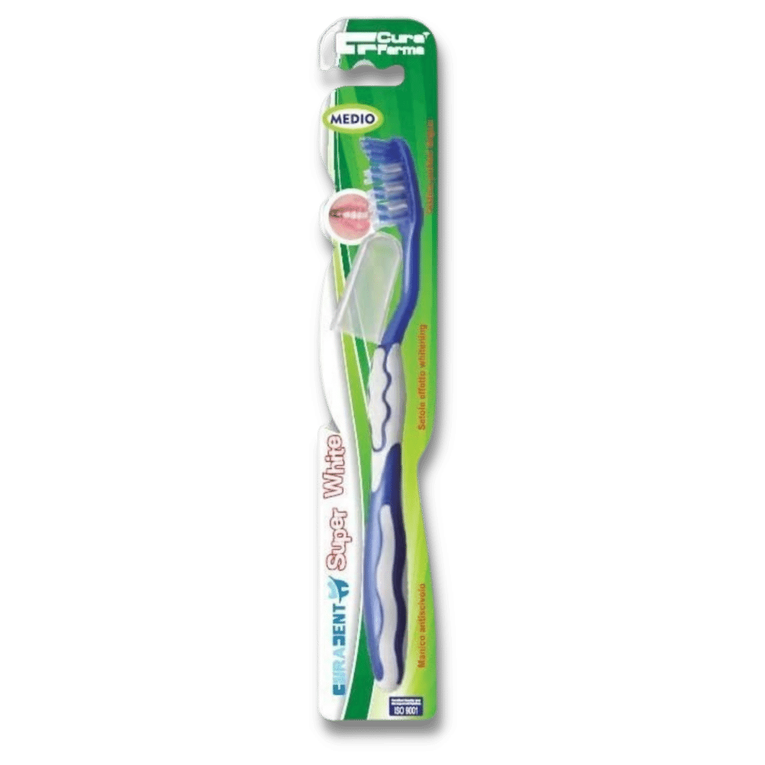 Super White 🦷 con setole media durezza con lamelle per effetto sbiancante. Testina pulisci-lingua.