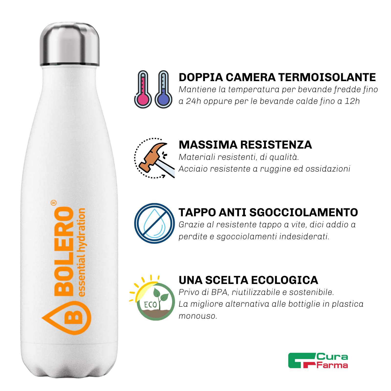 Goditi i gusti unici Bolero nel pratico formato da 500ml. La borraccia è resistente agli shock, è dotata di cappuccio a vite con guarnizione a prova di perdita. Grazie alla doppia camera protegge le tue bevande da shock termici, mantenendo una temperatura costante.