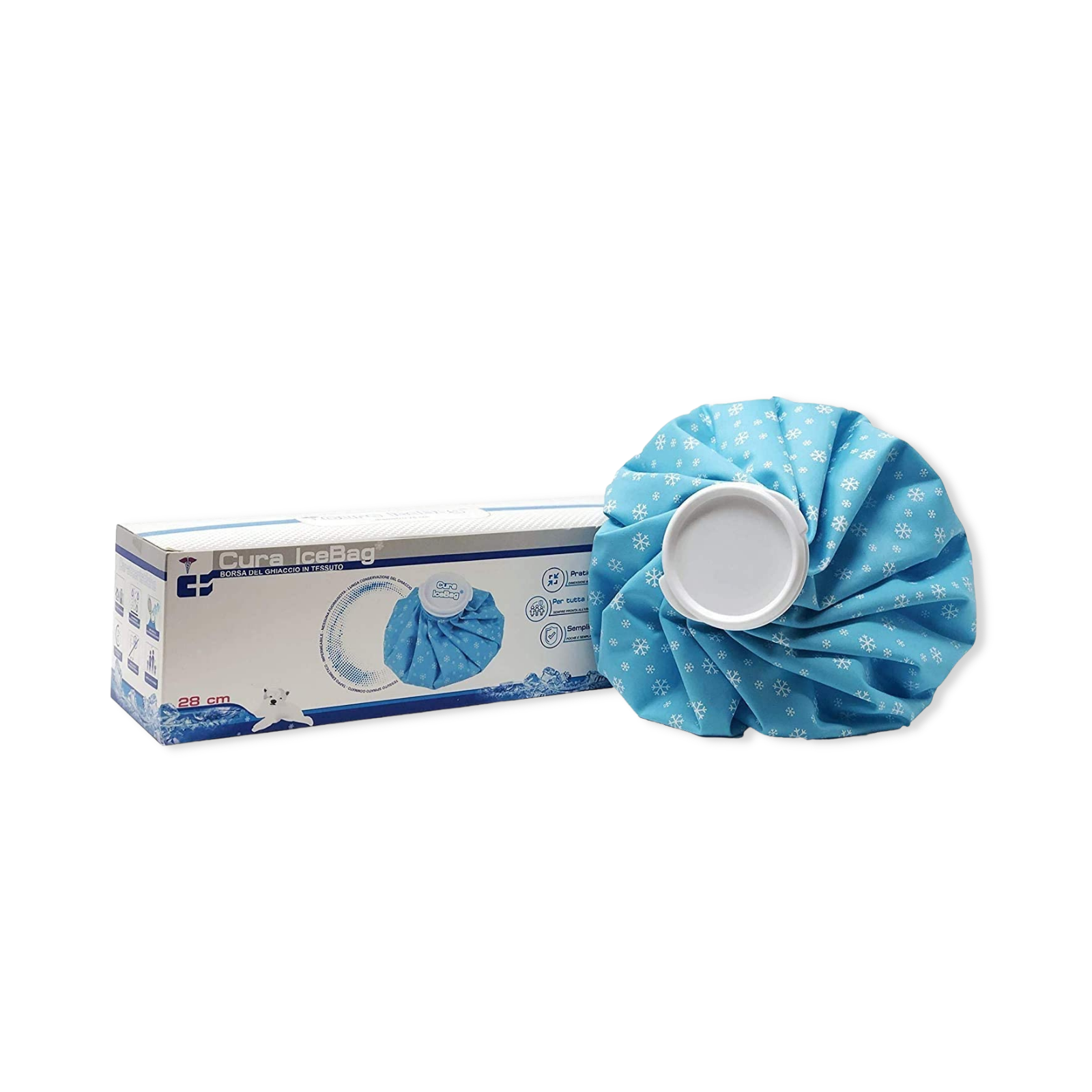 Borsa per ghiaccio in tessuto gommato. Garantisce la tenuta del ghiaccio per un periodo prolungato, con tappo di chiusura a vite ermetico. Prodotto per il trattamento crioterapico/terapia freddo di contusioni, ematomi, traumi in genere.