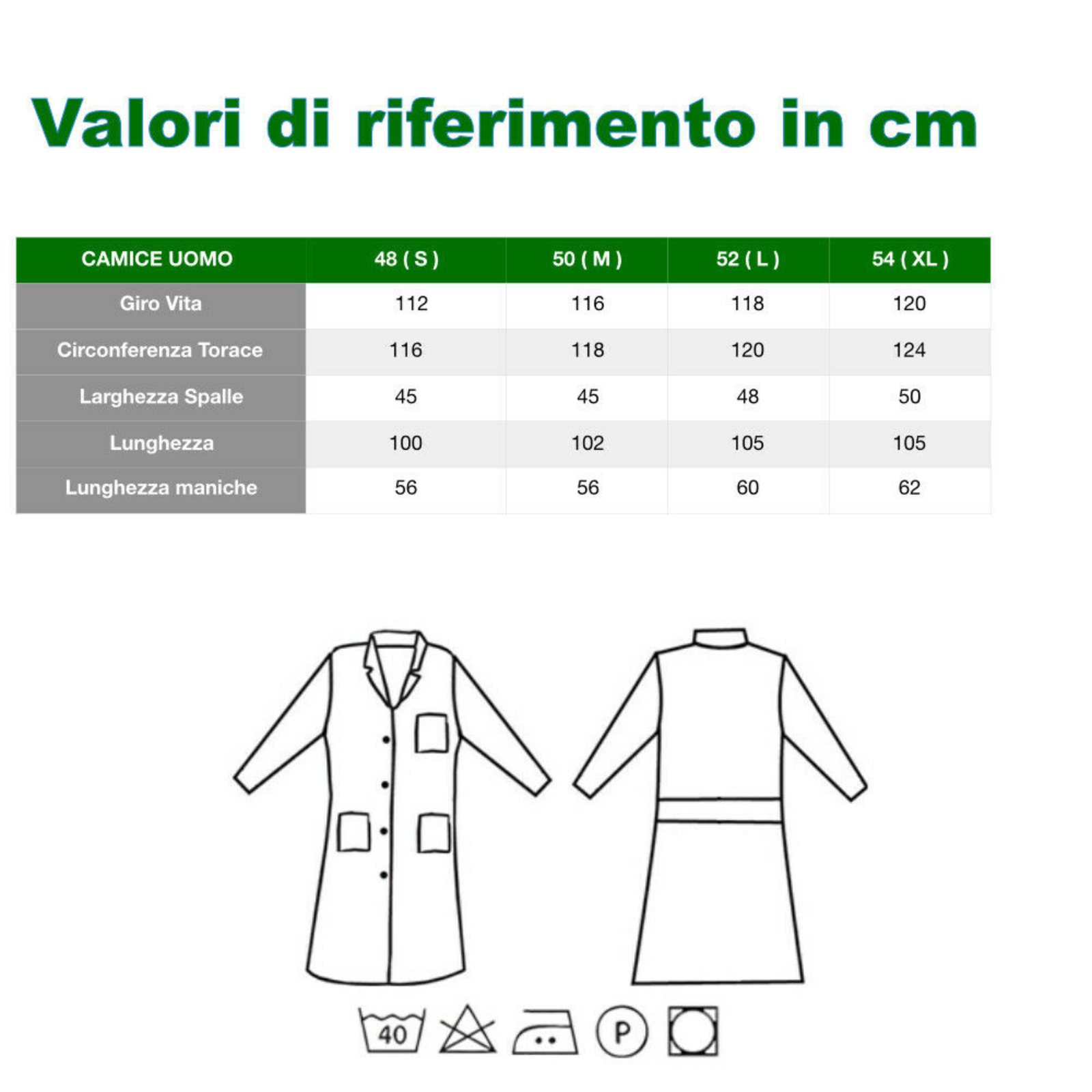 Cotone misto poliestere, per rendere il camice antirestringimento, antimacchia e facile da stirare, offrendo elevata resistenza ad abrasioni e lacerazioni o tagli. Non si sgualcisce e non si stropiccia, mantiene la piega anche senza stiratura. Tessuto anti batterico ed anti muffa. Asciuga rapidamente.