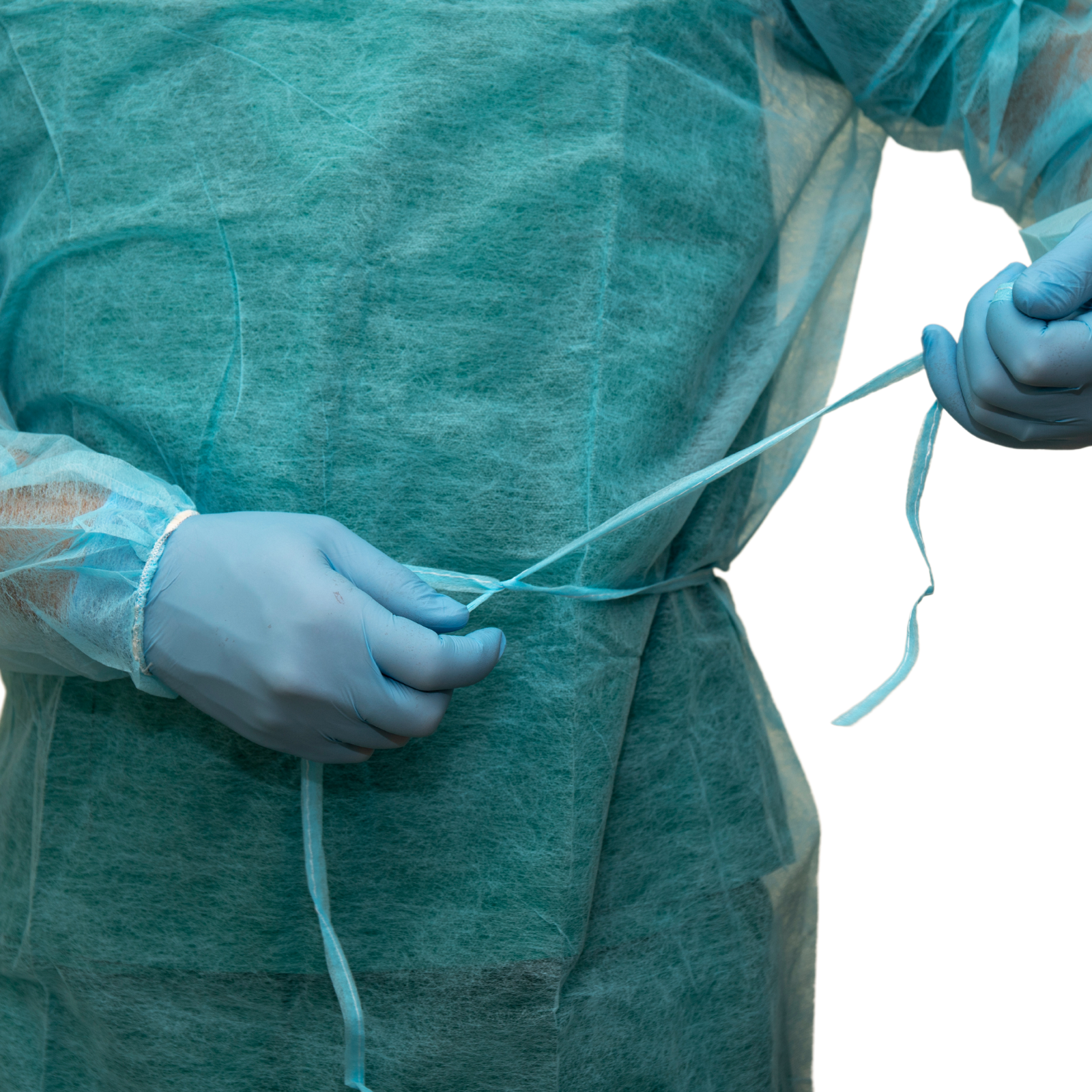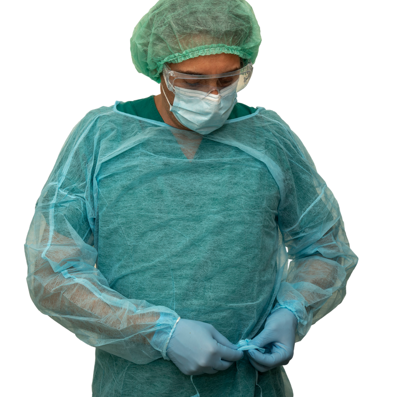 Camici in TNT monouso non sterili con polsini elastici ipoallergenici, a manica lunga.