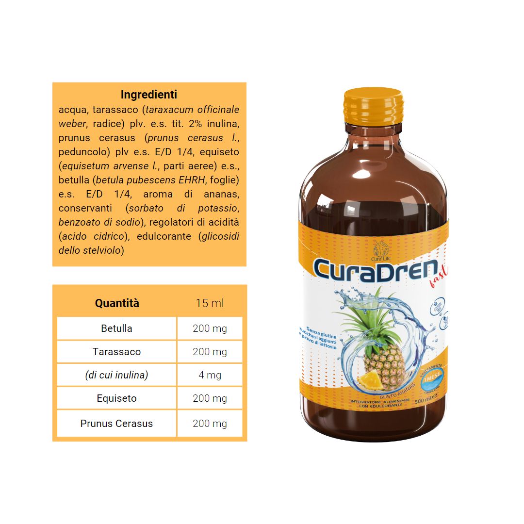 Grazie alla sua formulazione in sciroppo concentrato, ha un effetto rapido ed efficace, per conferire sollievo immediato. CuraDren Fast Ananas ha un gusto rinfrescante e fruttato, senza zucchero aggiunto, naturalmente privo di glutine e lattosio. Una confezione da 500 ml garantisce un mese di trattamento, con una posologia consigliata di 15 ml al giorno. CuraDren Fast Ananas è un prodotto made in Italy, realizzato da Cura Farma, un'azienda specializzata nella produzione di integratori alimentari e cosmetici naturali.