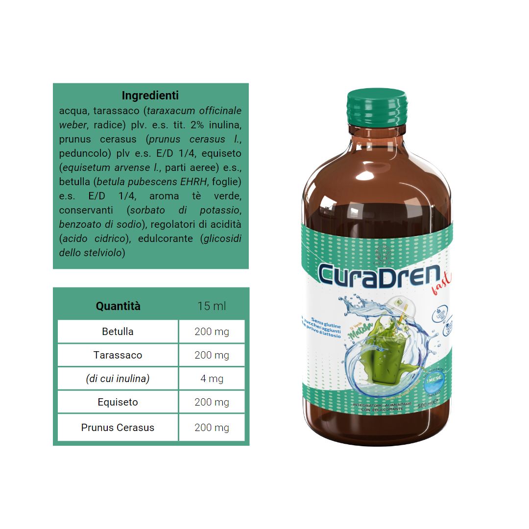 Curadren Fast è un trattamento drenante completo al gusto mandorla, ideale per chi vuole eliminare i liquidi in eccesso e depurare l'organismo. Curadren Fast contiene estratti naturali di betulla, tarassaco, prunus ed esquieto, che favoriscono il drenaggio dei tessuti e la funzionalità renale. Curadren Fast Tè Macha è facile da usare: basta sciogliere un misurino in una bottiglia d'acqua e bere nell'arco della giornata, preferibilmente al mattino e alla sera. Curadren Fast è un prodotto made in Italy, sicuro ed efficace, che ti aiuta a ritrovare il tuo benessere e la tua forma fisica.