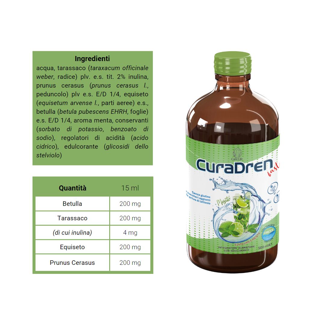 Se stai cercando un prodotto efficace e naturale per eliminare i liquidi in eccesso e depurare il tuo organismo, prova Curadren Fast. Si tratta di un trattamento drenante completo al gusto mojito, made in Italy, che ti aiuta a ritrovare il tuo benessere e la tua forma fisica. Curadren Fast contiene estratti vegetali di ananas, tarassaco, ortosifon e betulla, che favoriscono il drenaggio dei liquidi e l'eliminazione delle tossine. Una confezione da 500 ml garantisce un mese di trattamento, con una posologia consigliata di 15 ml al giorno. CuraDren Fast Mojito è un prodotto made in Italy, realizzato da Cura Farma, un'azienda specializzata nella produzione di integratori alimentari e cosmetici naturali.