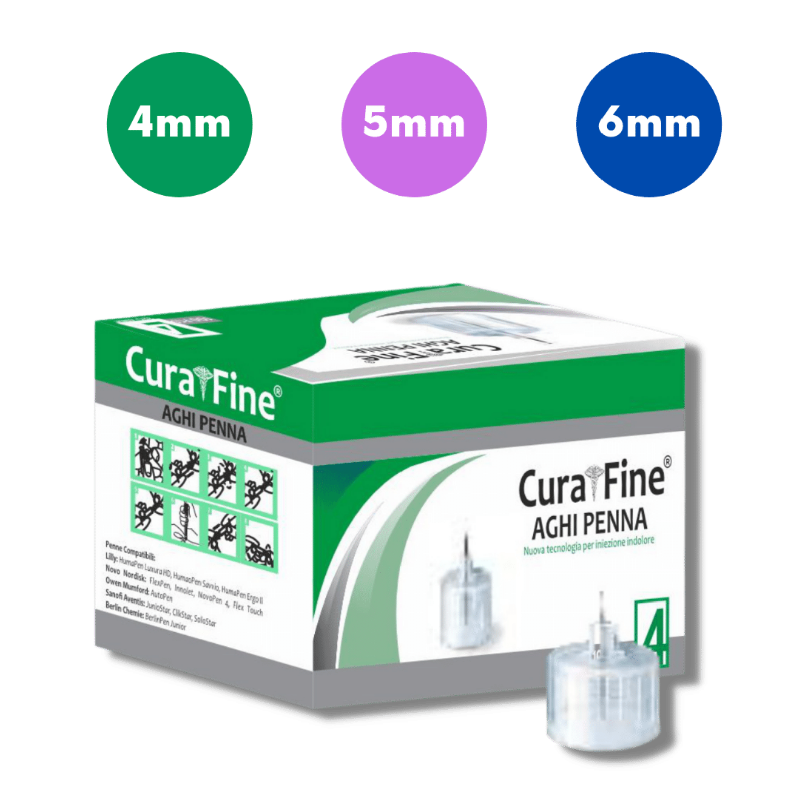 Gli aghi per penna da insulina CuraFine® sono compatibili con tutte le principali marche di penne. Sterili, atossici, apirogeni ed atraumatici. Assicurano un’iniezione semplice e meno dolorosa, grazie alla punta sottile 32G.
