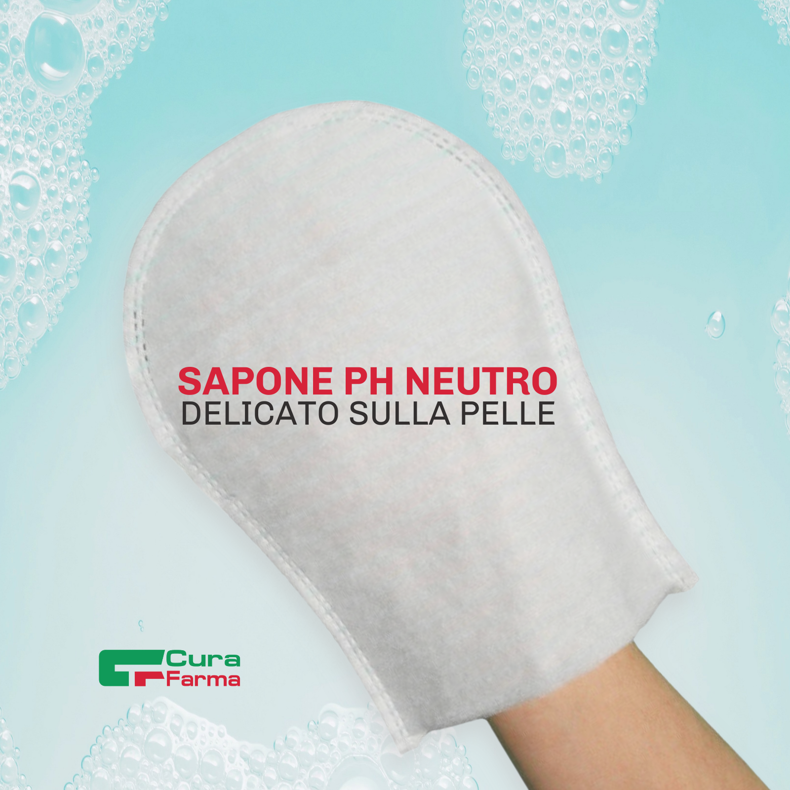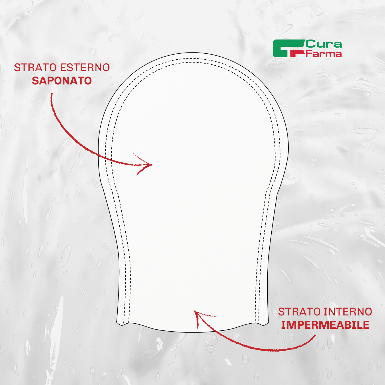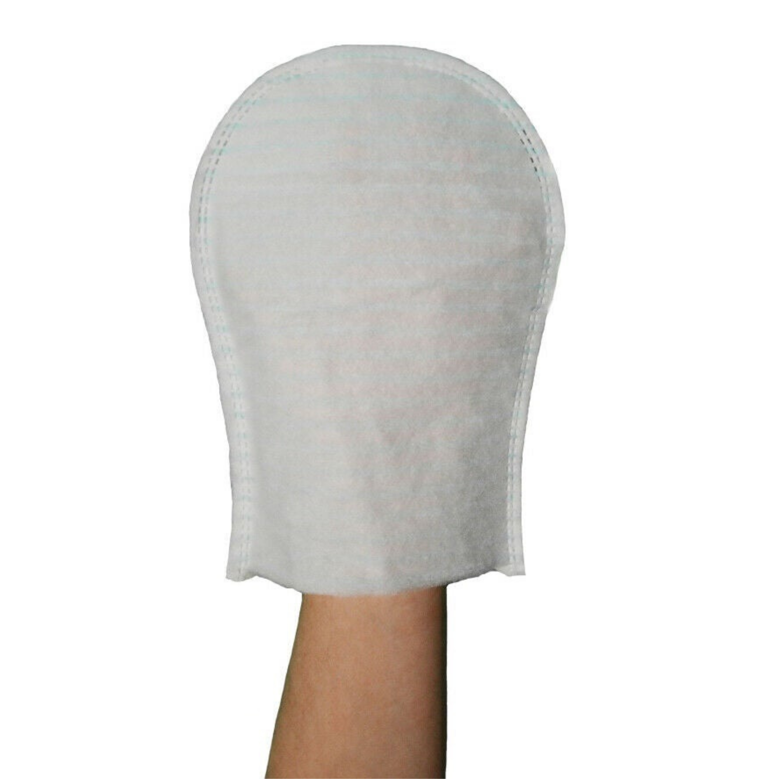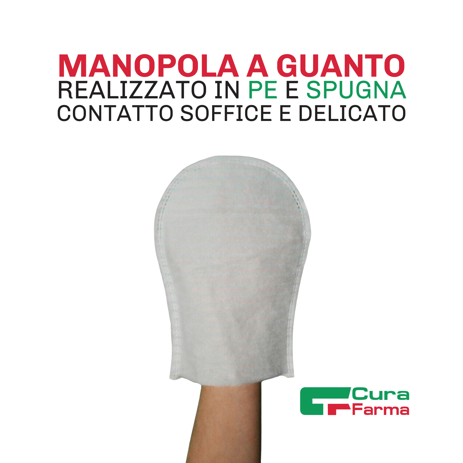MANOPOLA SAPONATA ERGONOMICA, con forma di guanto. È fatta di polietilene e spugna e contiene sapone a pH neutro secco che ha un profumo delicato. La manopola ha 4 strati che sono uniti con ultrasuoni. La parte interna è impermeabile e impedisce all'operatore di toccare direttamente il paziente.
