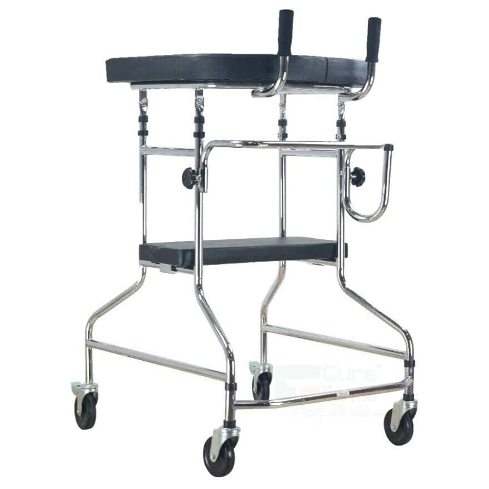 Deambulatore con appoggio a tavolino imbottito, con incavo e maniglie