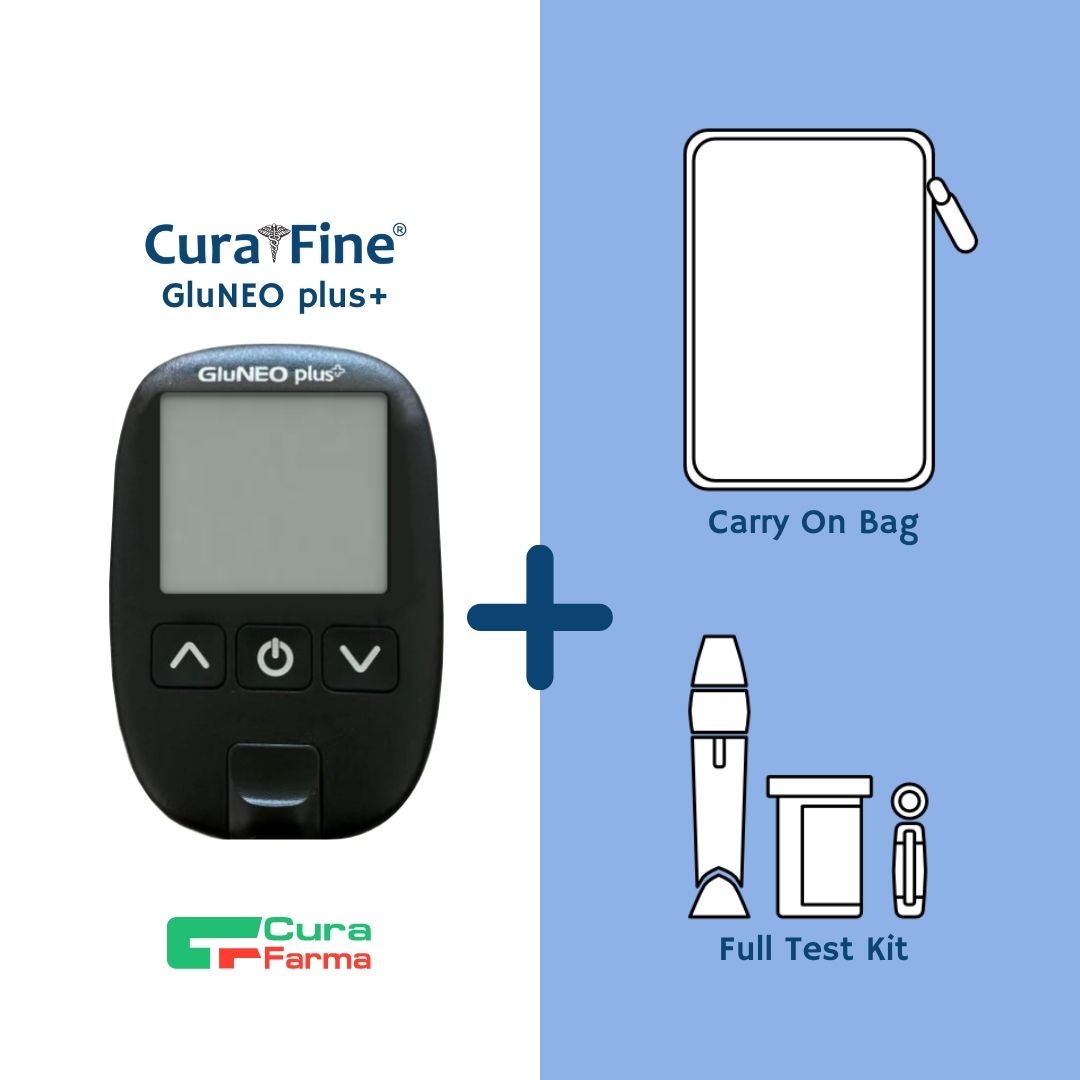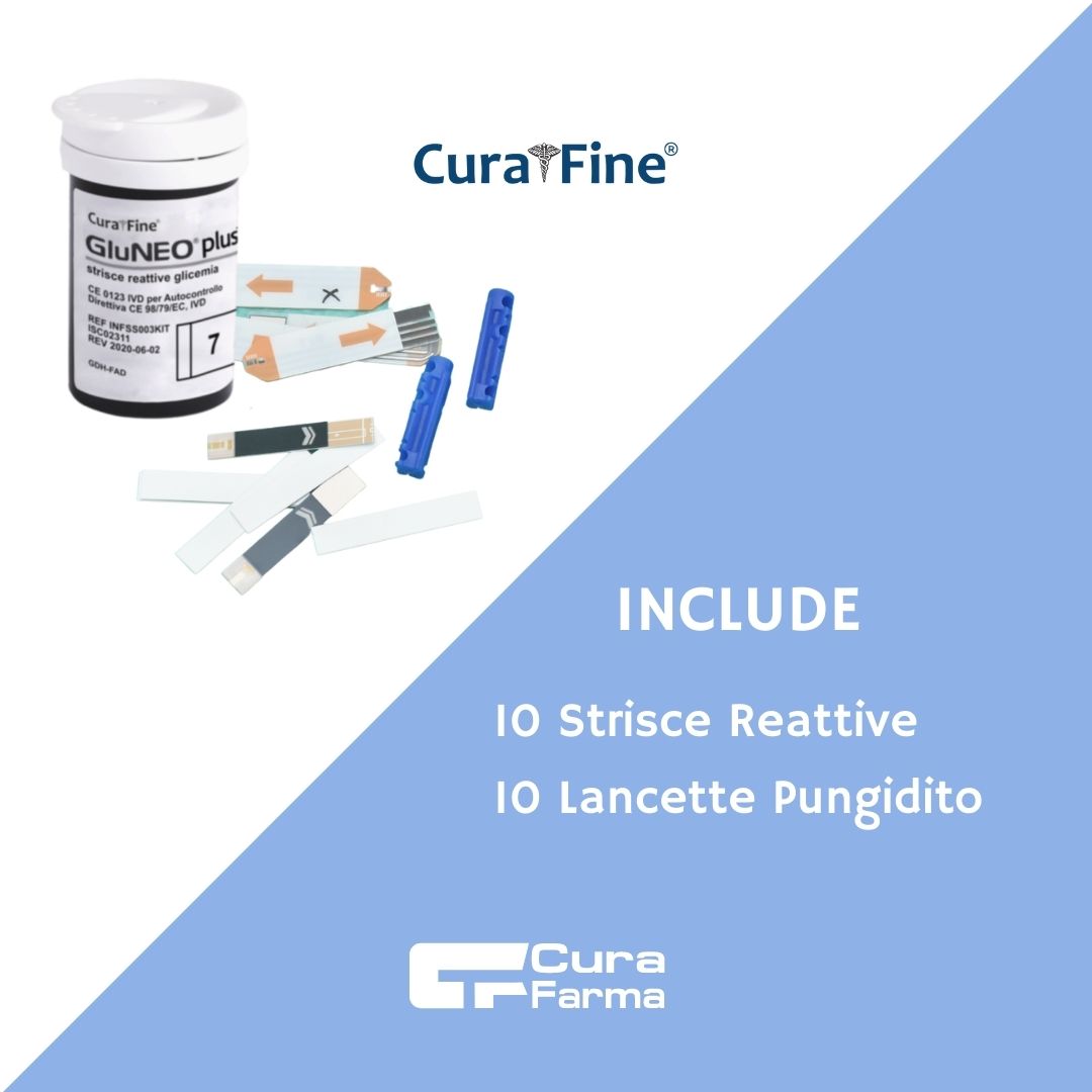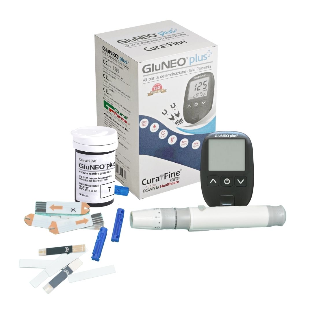 Il Kit include: Glucometro GluNEO® plus, Dispositivo pungidito, 10× Strisce reattive, 10× Lancette pungidito e custodia protettiva.