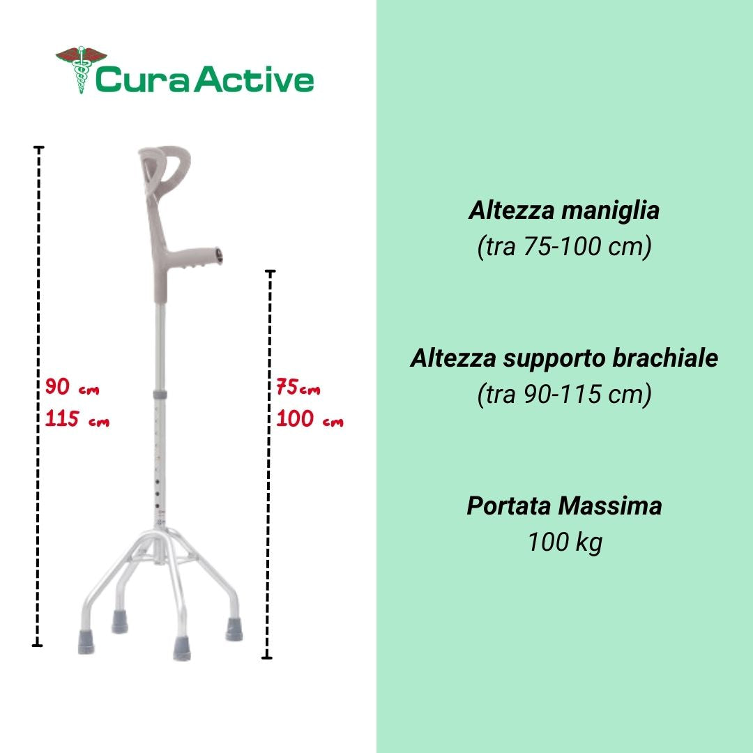 Il supporto brachiale e la maniglia ergonomica sono progettate per adattarsi comodamente alla mano, consentendo una presa salda e confortevole. Realizzato con materiali solidi e leggeri, questo ausilio passeggio offre un equilibrio ottimale tra robustezza e facilità d'uso.