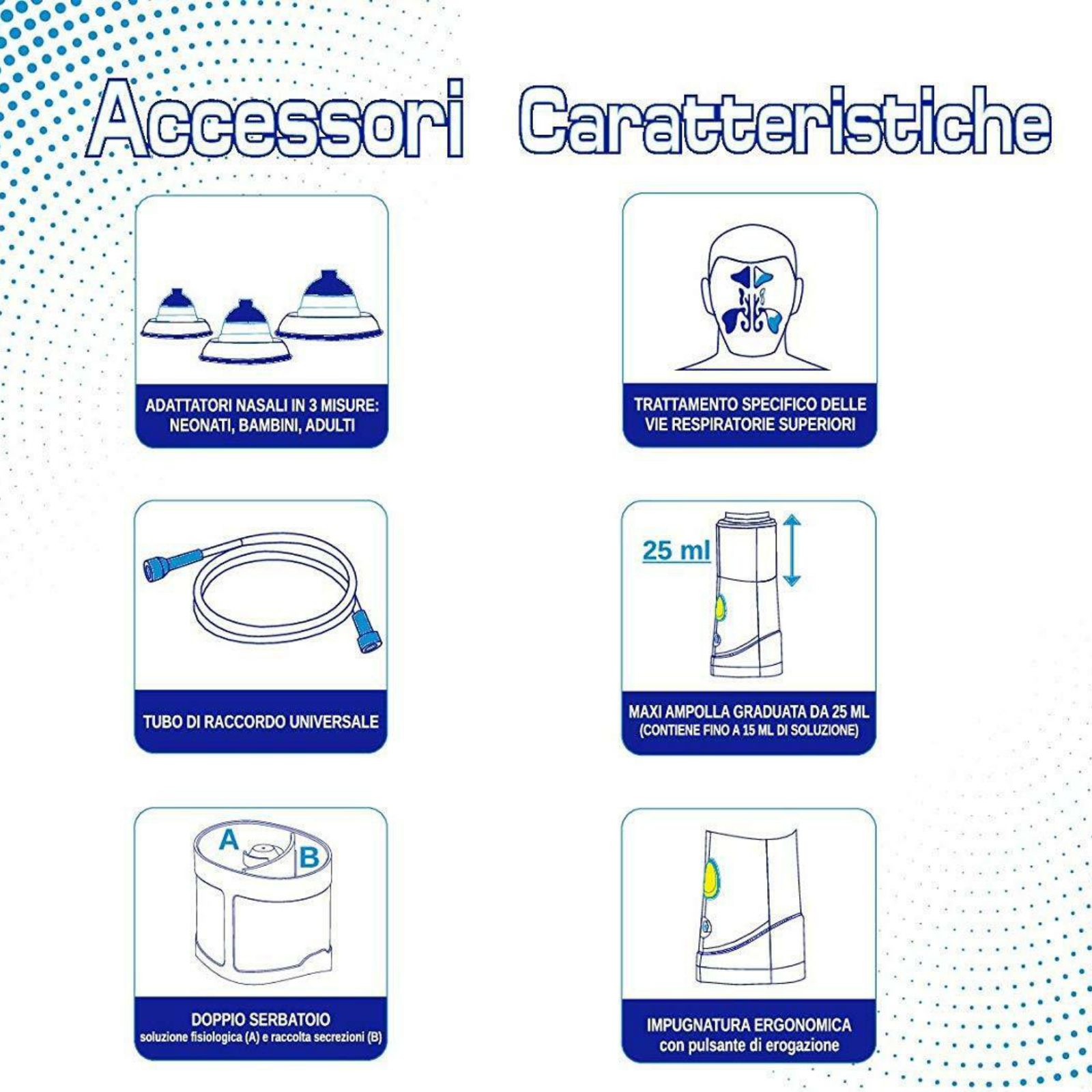 Doccia nasale adatta ad aerosolterapia, completa di accessori.