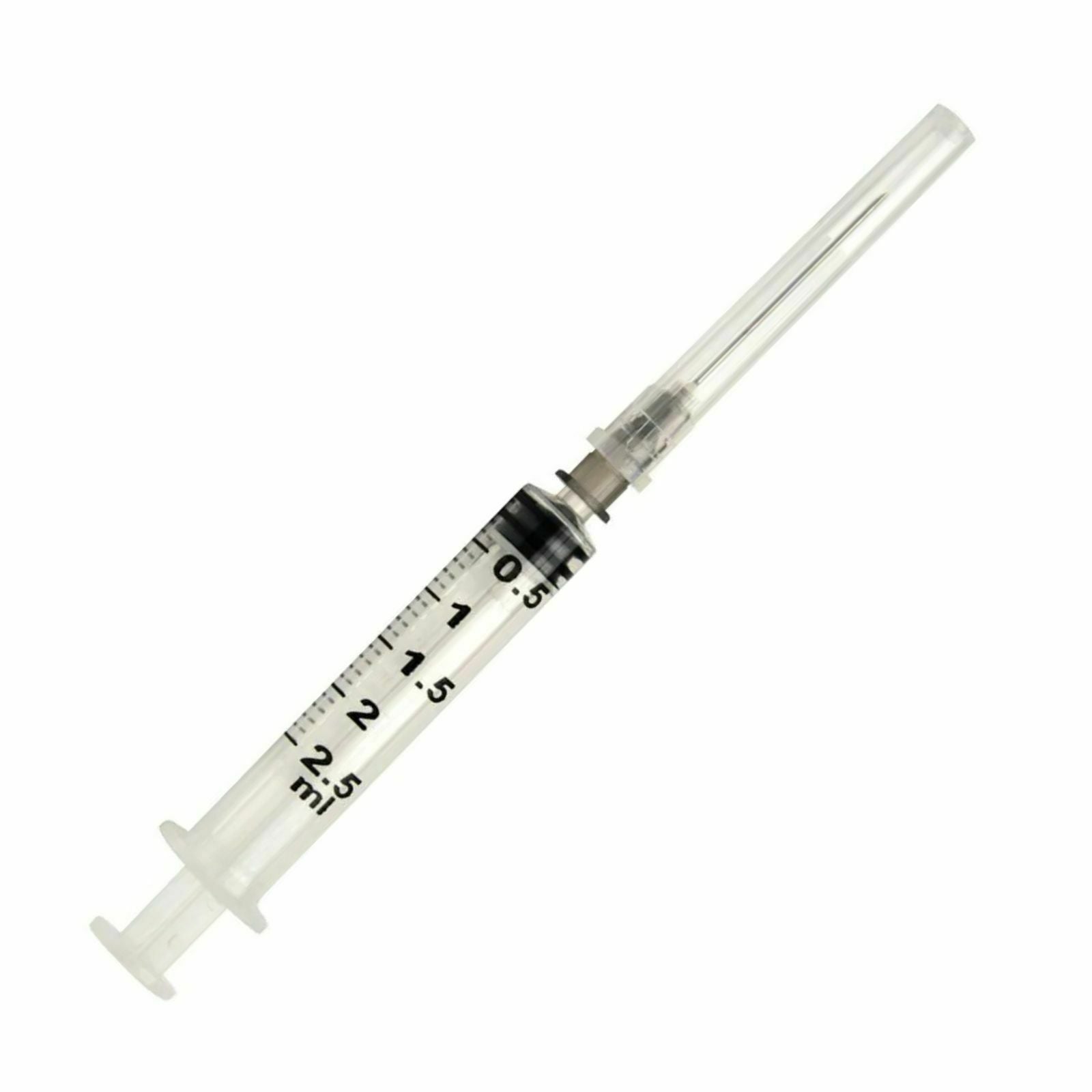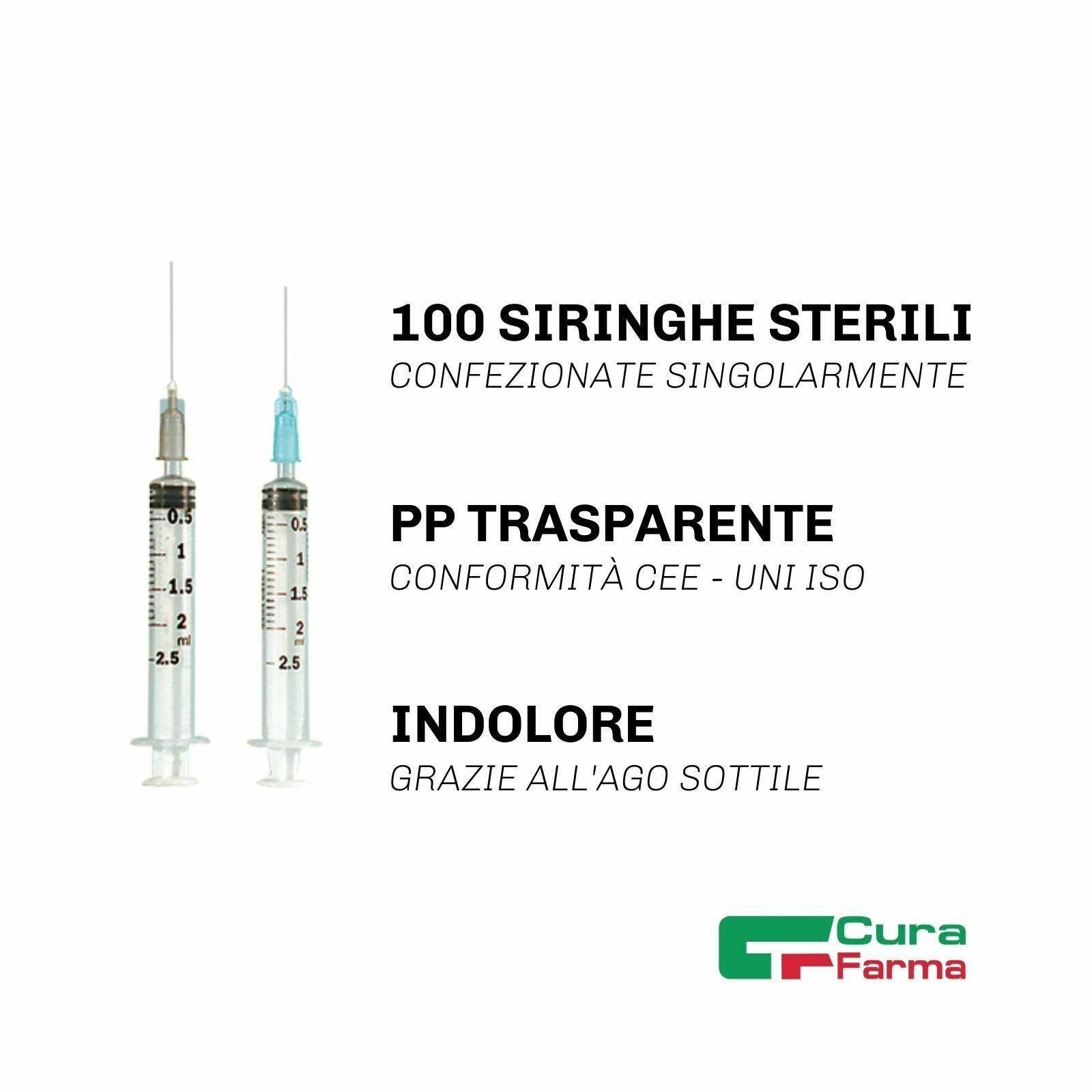 Siringa 2,5 ml sterile. Atossica ed asporigena, con attacco Luer. Priva di lattice.