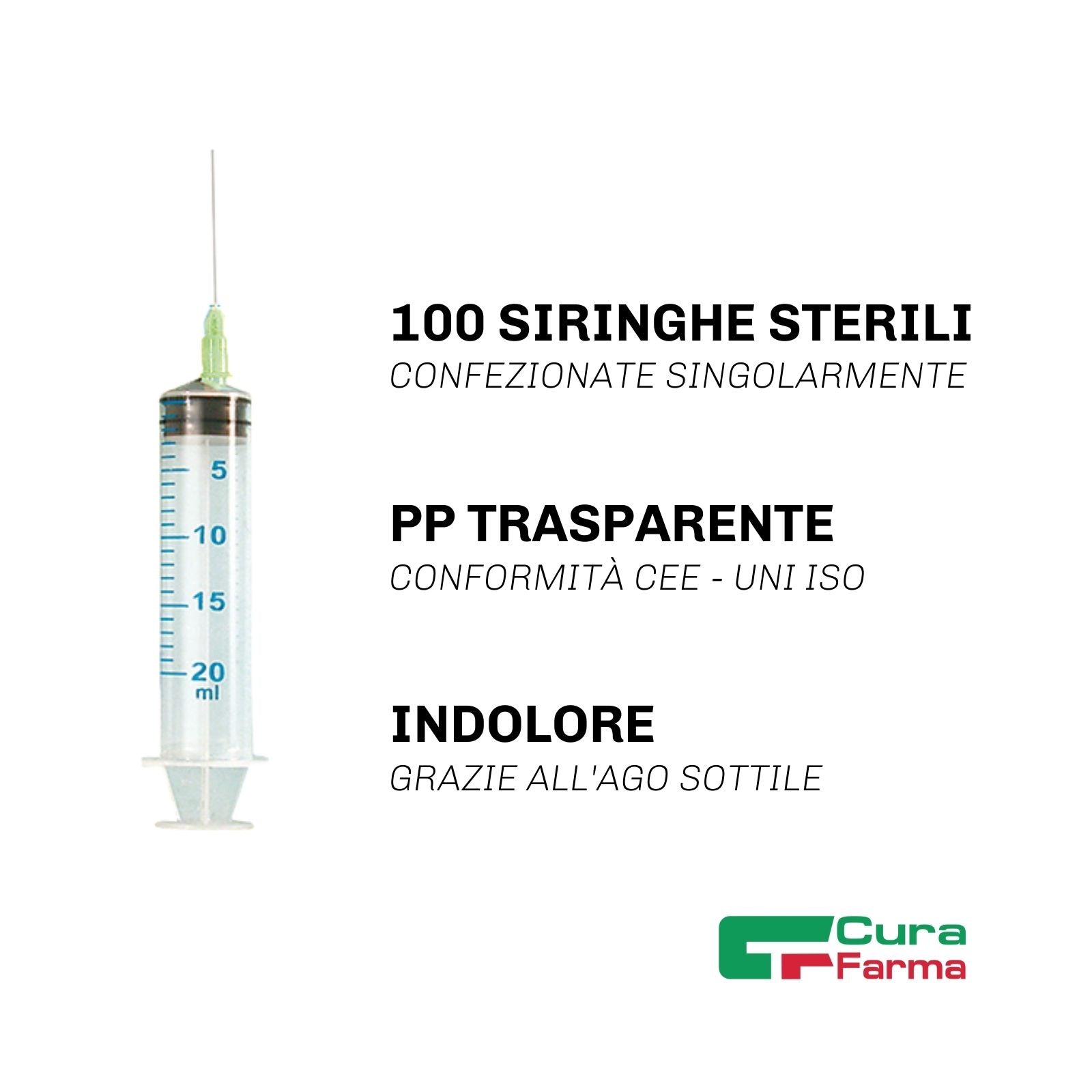 Siringa 20 ml sterile. Atossica ed asporigena, con attacco Luer. Priva di lattice.