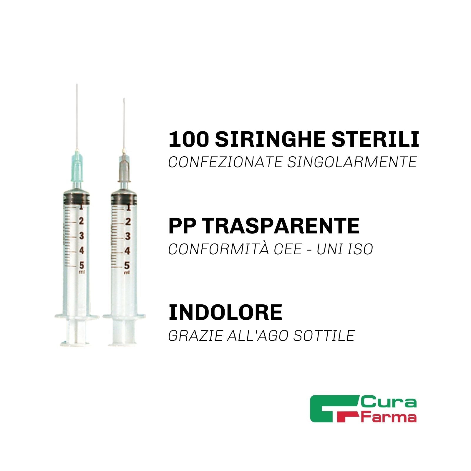 Siringa 5 ml sterile. Atossica ed asporigena, con attacco Luer. Priva di lattice.